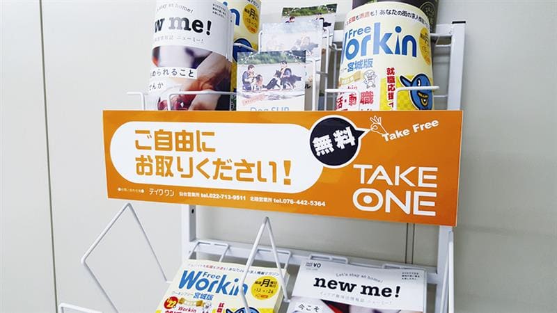 テイクワンボックスとは、スーパーマーケット、書店、駅等に設置されているフリーペーパーの集合型ラック。貴社のお役に立てる広告媒体です。